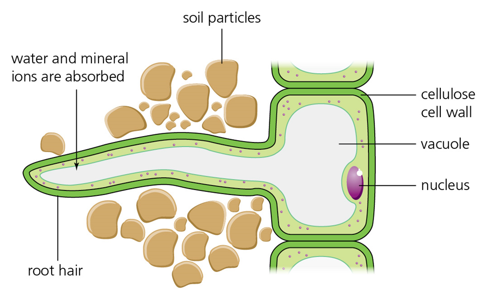 Plants absorb the mineral ions they require from the soil via active transport. Root hair cells provide a large surface area for the absorption of mineral ions.
